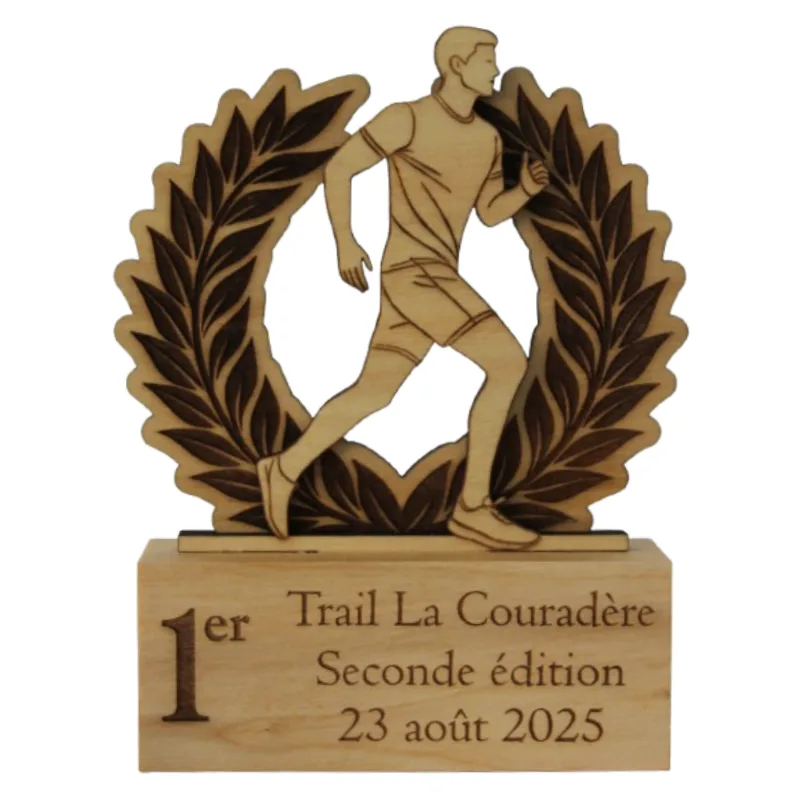 Trophée de course à pied ou trail en bois à personnaliser – homme et laurier